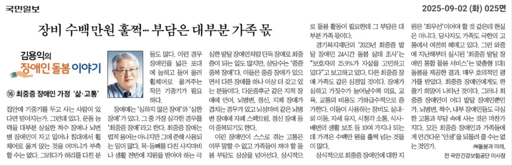 김용익의 장애인 돌봄 이야기 최중증 장애인 가정 ‘삶·고통’(국민일보 2025.9.2)...